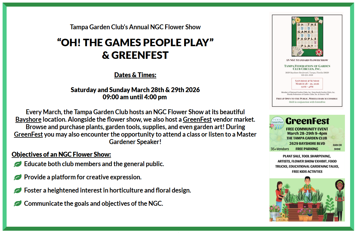 The Tampa Garden Club is a 501(c)3 non-profit organization dedicated to educating, beautifying, and conserving our environment.